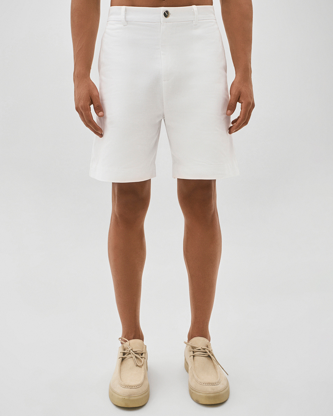 O short midi de sarja branco une design atemporal e caimento confortável em tecido 100% algodão sem elasticidade, garantindo respirabilidade e durabilidade para o dia a dia. Os recortes frontais e a barra convencional mantêm o visual clean e alinhado. O cós reto com braguilha em zíper e fechamento com gancho colchete e botão interno assegura acabamento limpo e seguro, reforçando a leitura de alfaiataria casual. Ideal para compor looks casuais com personalidade, do urbano ao resort chic.