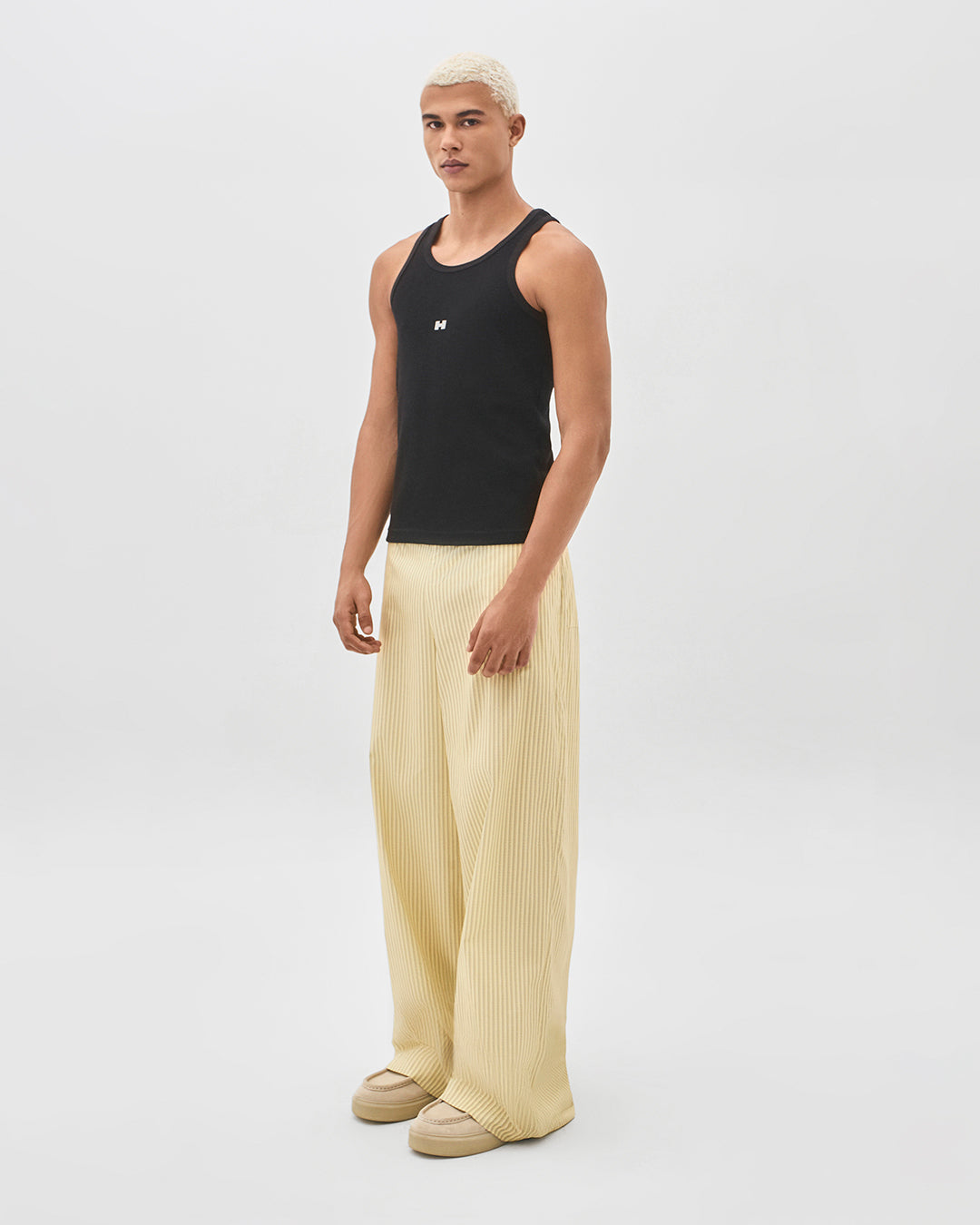 A Calça Unissex 100% algodão recebe acabamento mercerizado para brilho sutil, toque mais suave e maior resistência, traduzindo qualidade material com superfície lisa e caimento moderno. A modelagem reta entrega conforto e alinhamento visual, enquanto o cós reto com elástico na parte traseira garante ajuste prático sem perder a estrutura. Os bolsos laterais profundos e os bolsos traseiros funcionais elevam a usabilidade no dia a dia, mantendo a estética clean com costuras tonais. A estampa exclusiva forma listras a partir das letras H da logo, adicionando identidade gráfica e estilo autoral à peça. Um essencial contemporâneo que transita do urbano ao casual sofisticado com versatilidade.